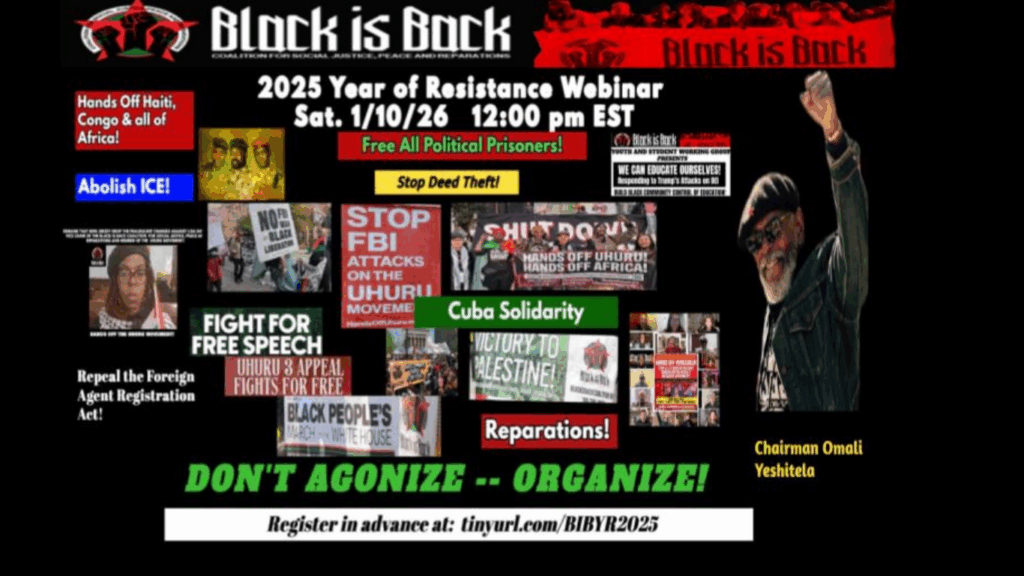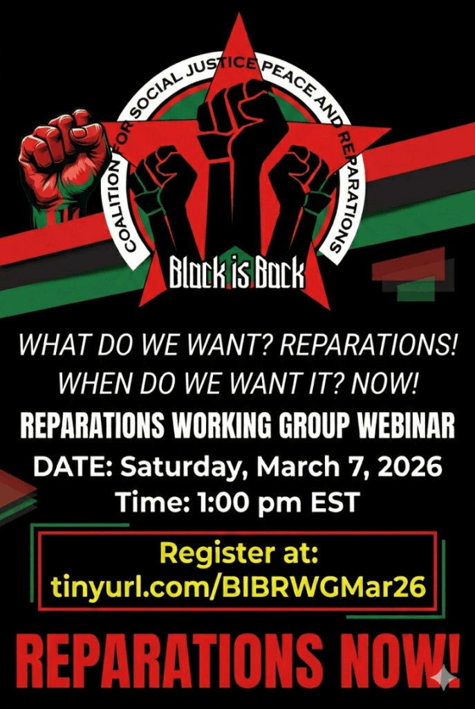 The Black is Back Coalition for Social Justice, Peace and Reparations Reparations Working Group Webinar Saturday, March 7, 2026 1pm EST/12 noon CST/10am PST Register now The Black is Back Coalition for Social Justice, Peace and Reparations is a coalition of black organizations, founded in 2009, by Omali Yeshitela, Chairman of the African People’s Socialist […]